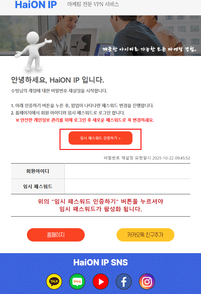 3) 인증이확인되면 임시패스워드로 로그인 진행